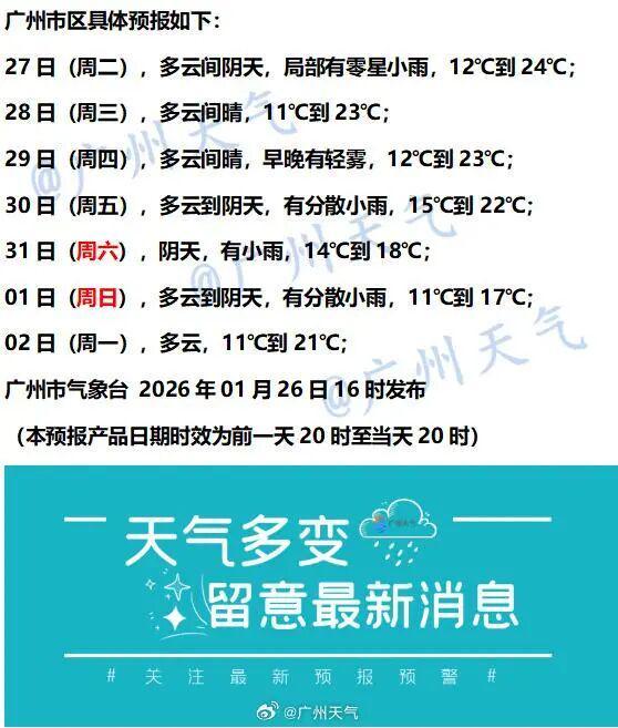 广州市气象台预计,1月27日弱冷空气渗透,广州多云间阴天,局部有零星小雨,气温小幅下降。1月28日—29日,广州多云间晴。